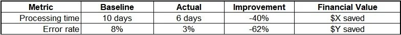 Estimate that impact in time saved, costs reduced, or revenue generated.